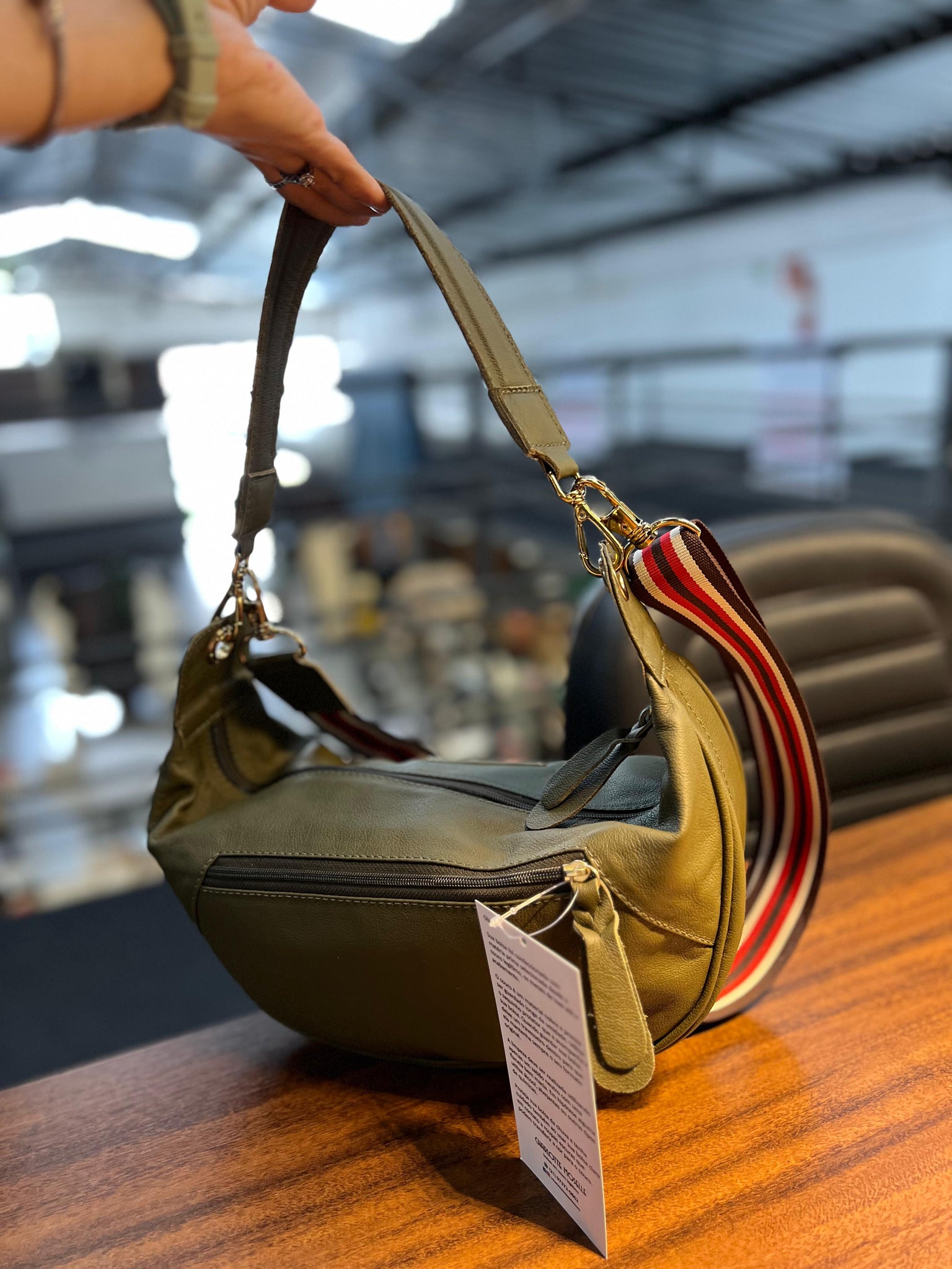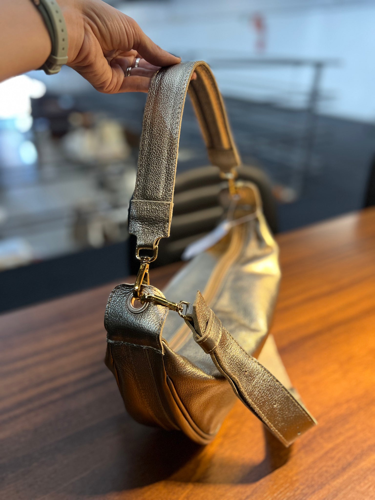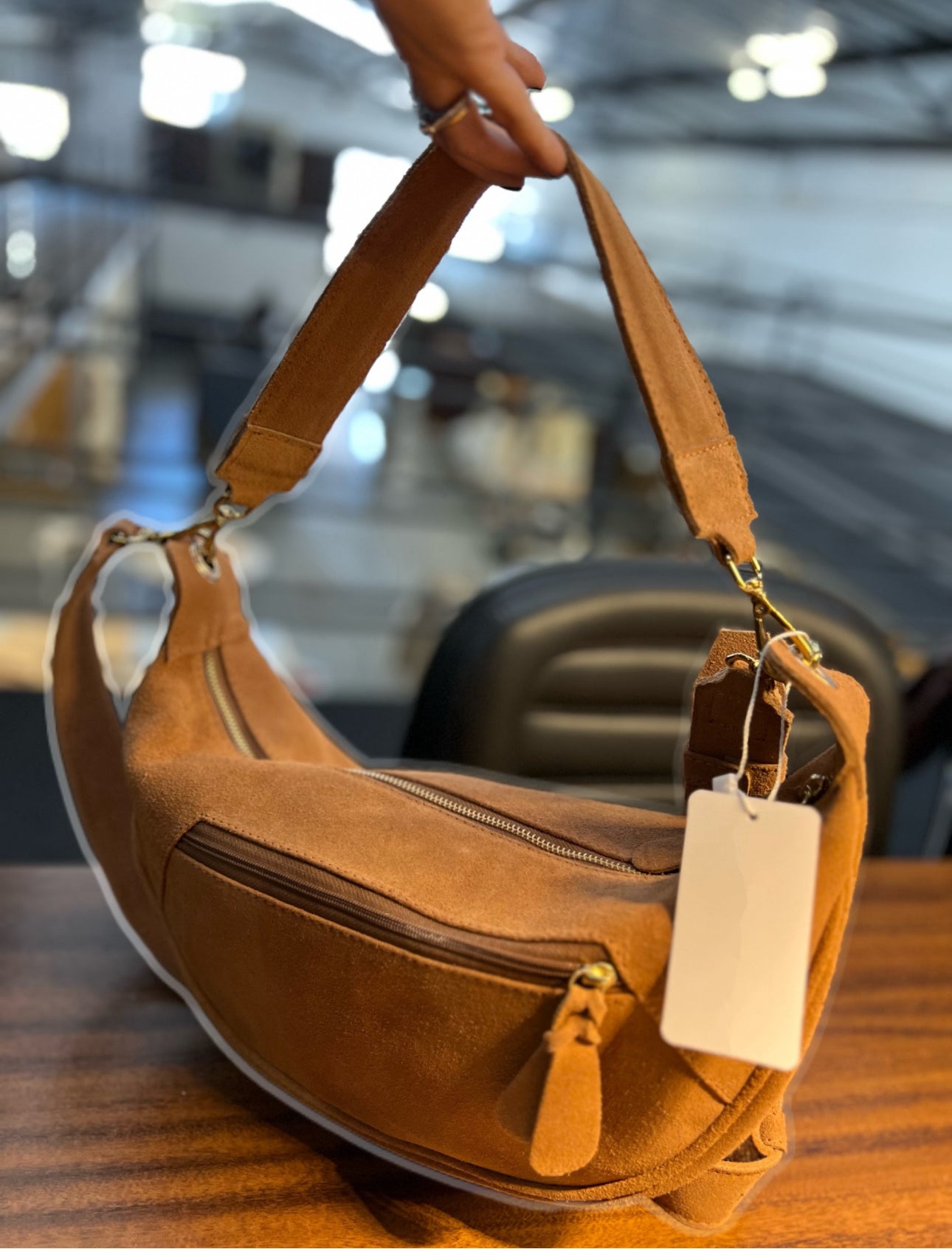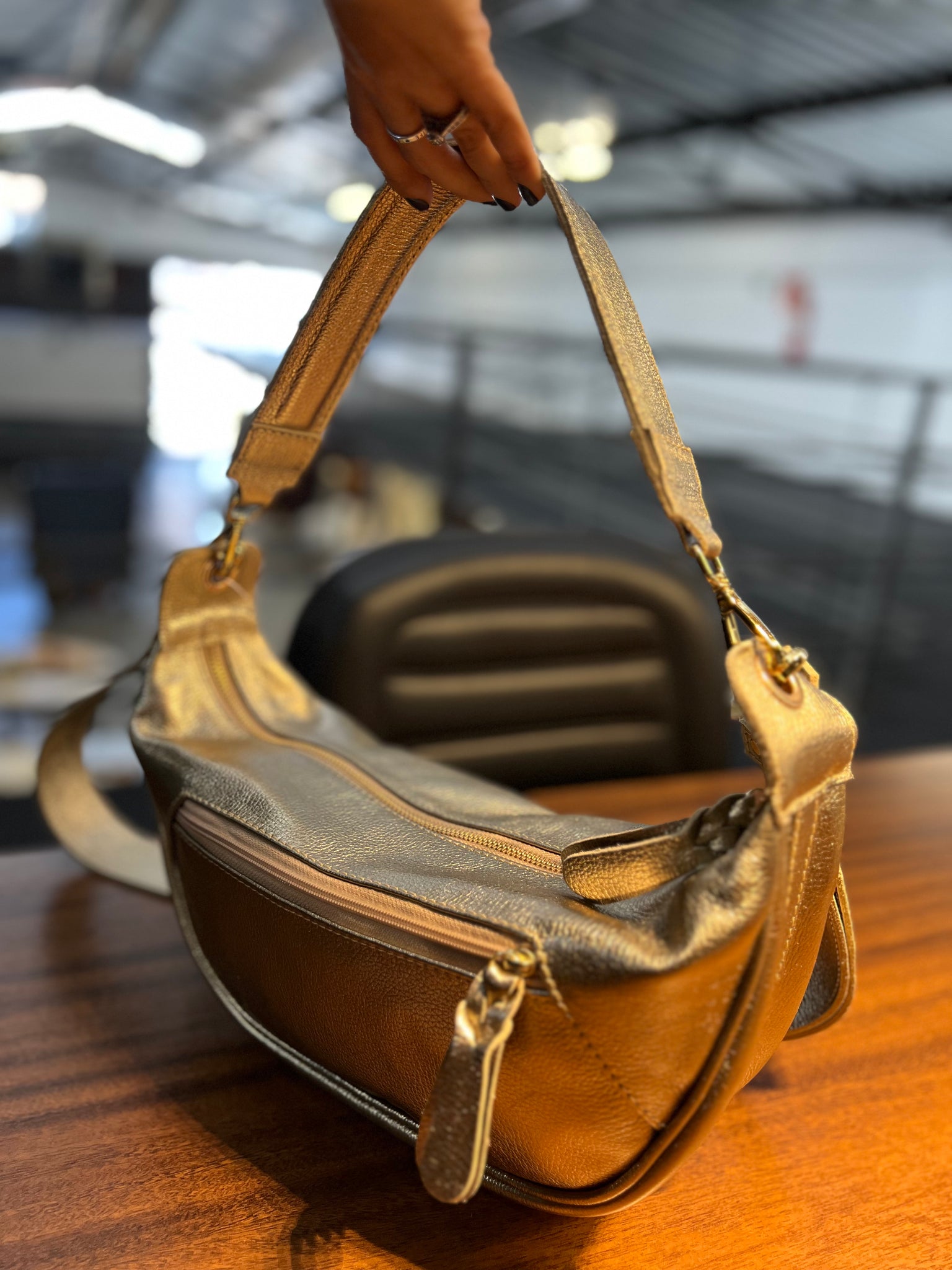 Bolsa modelo meia lua, bolso atrás com zíper, duas alças, 1 fixa e outra removível, bolso interno + espelhinho