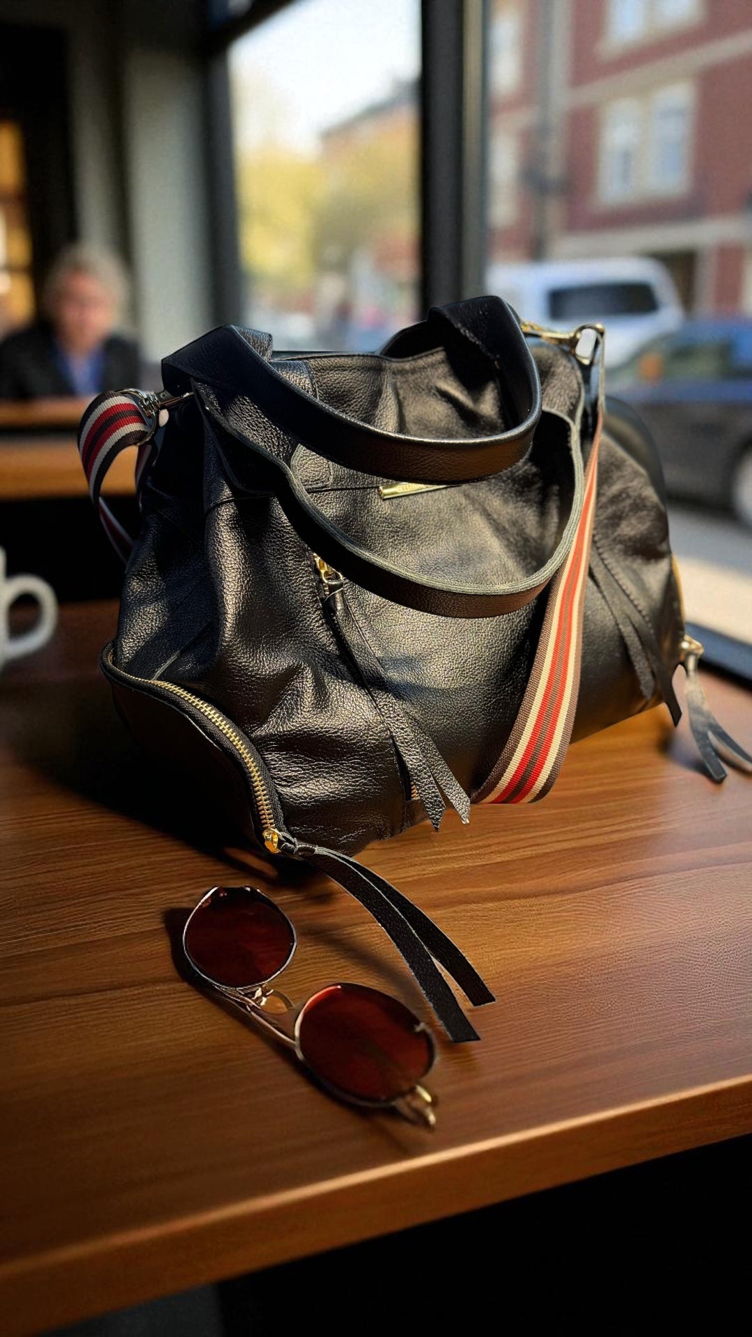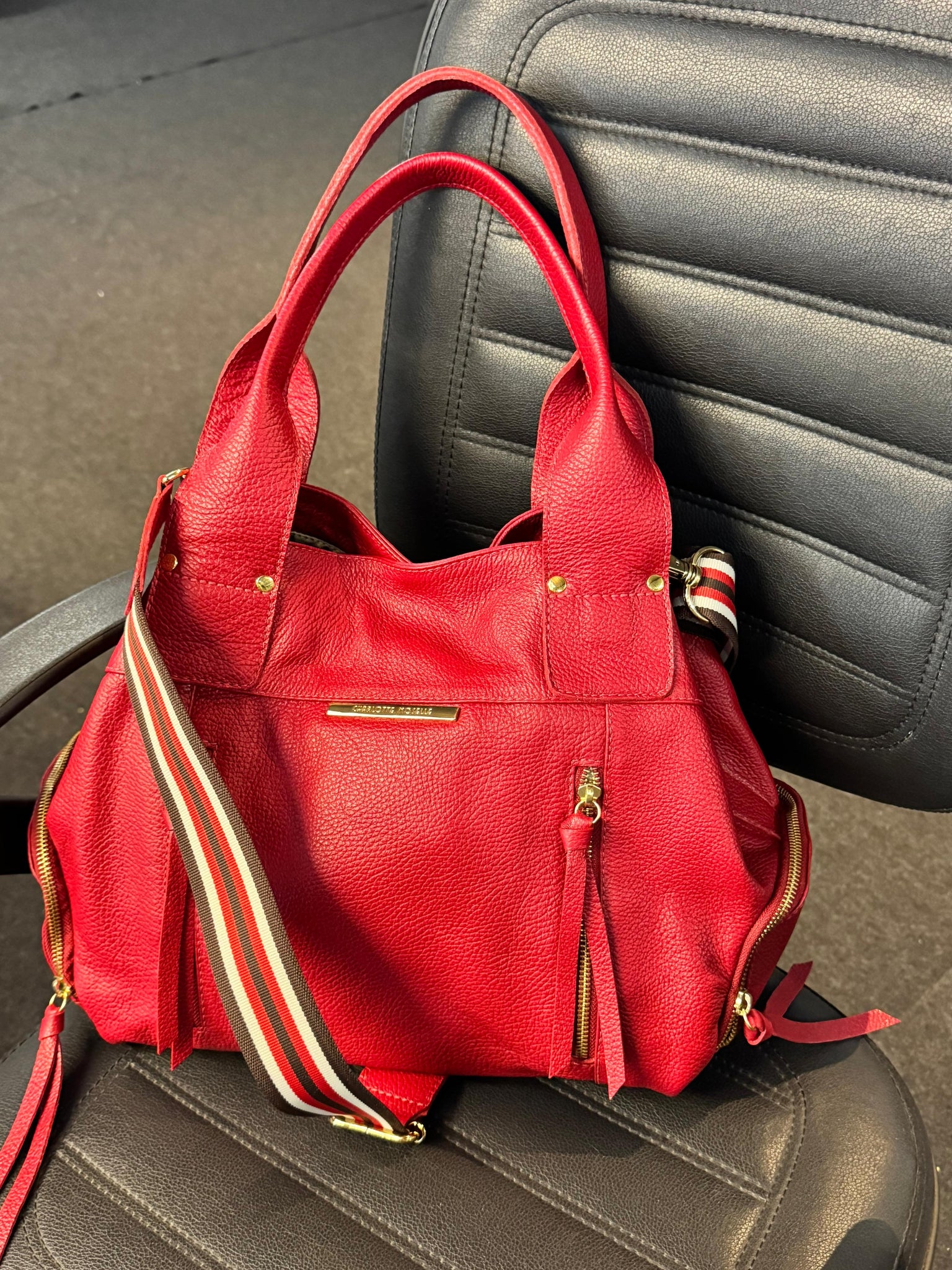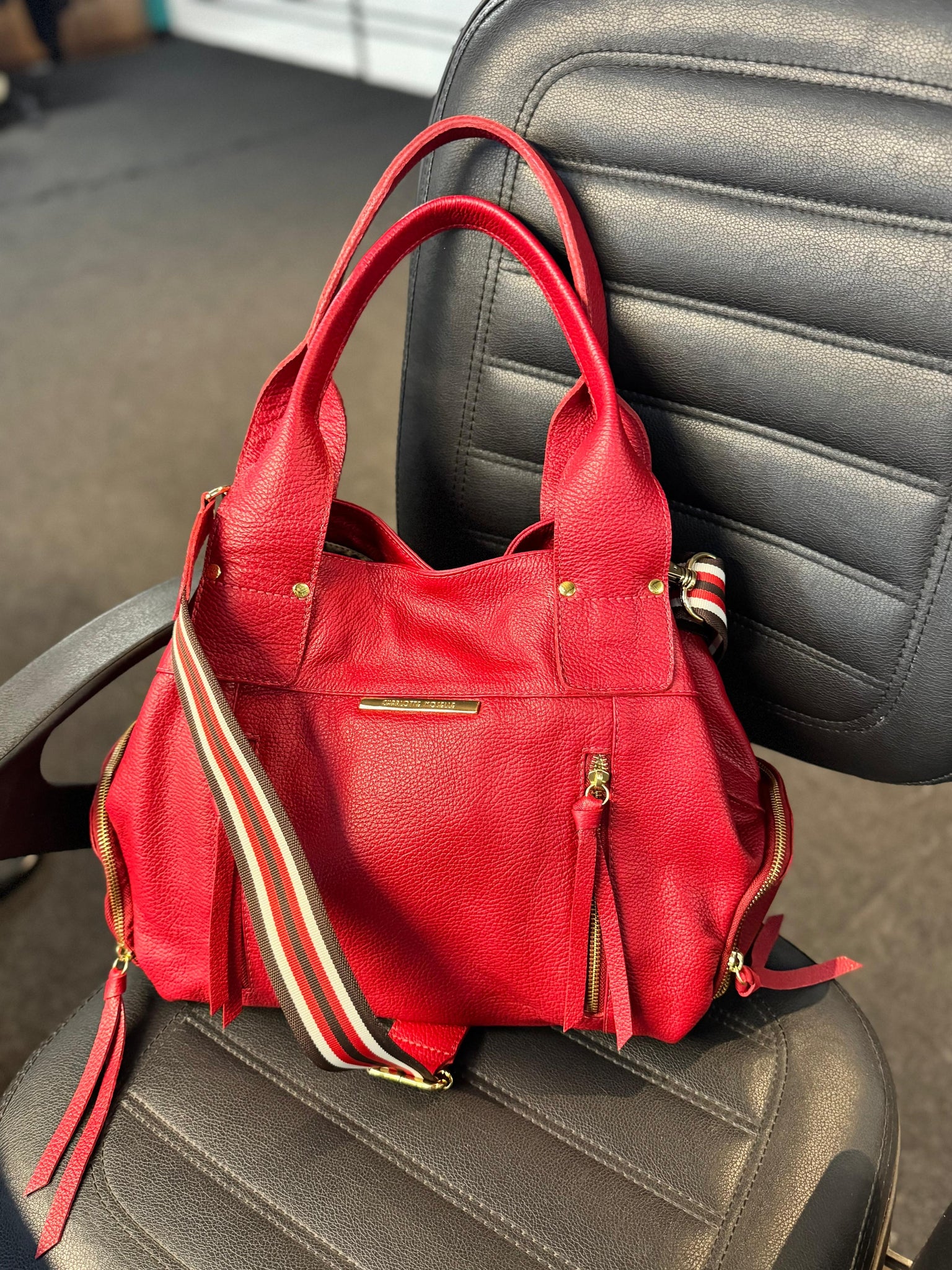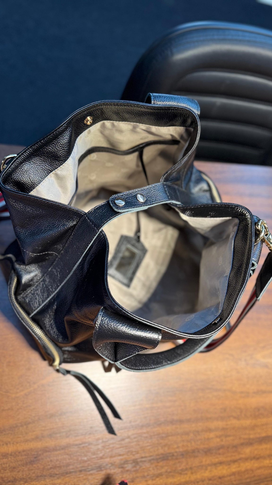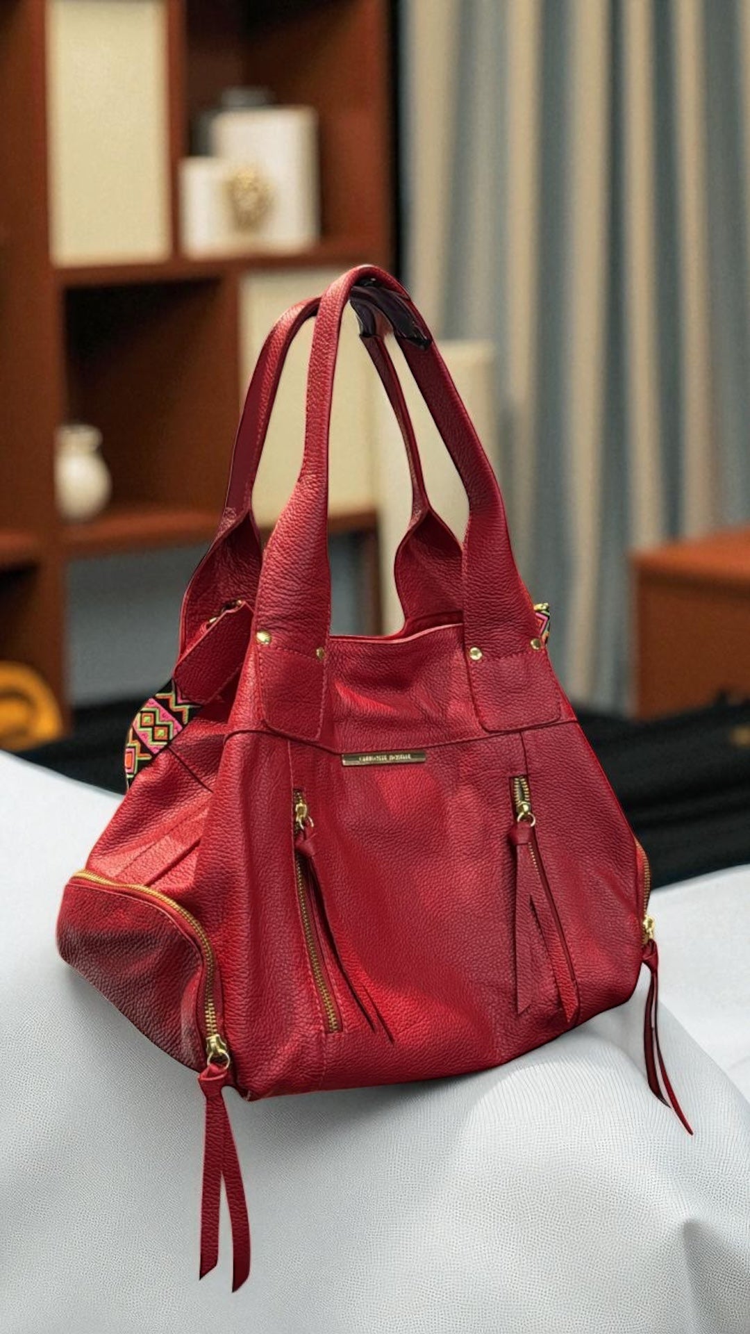 Essa é a bolsa MONTEVIDÉO, feita com 100% couro legítimo e metais de luxo. Ela é grande, cabe tudo, tem 36 cm de largura por 35 cm de altura e 19 de profundidade.