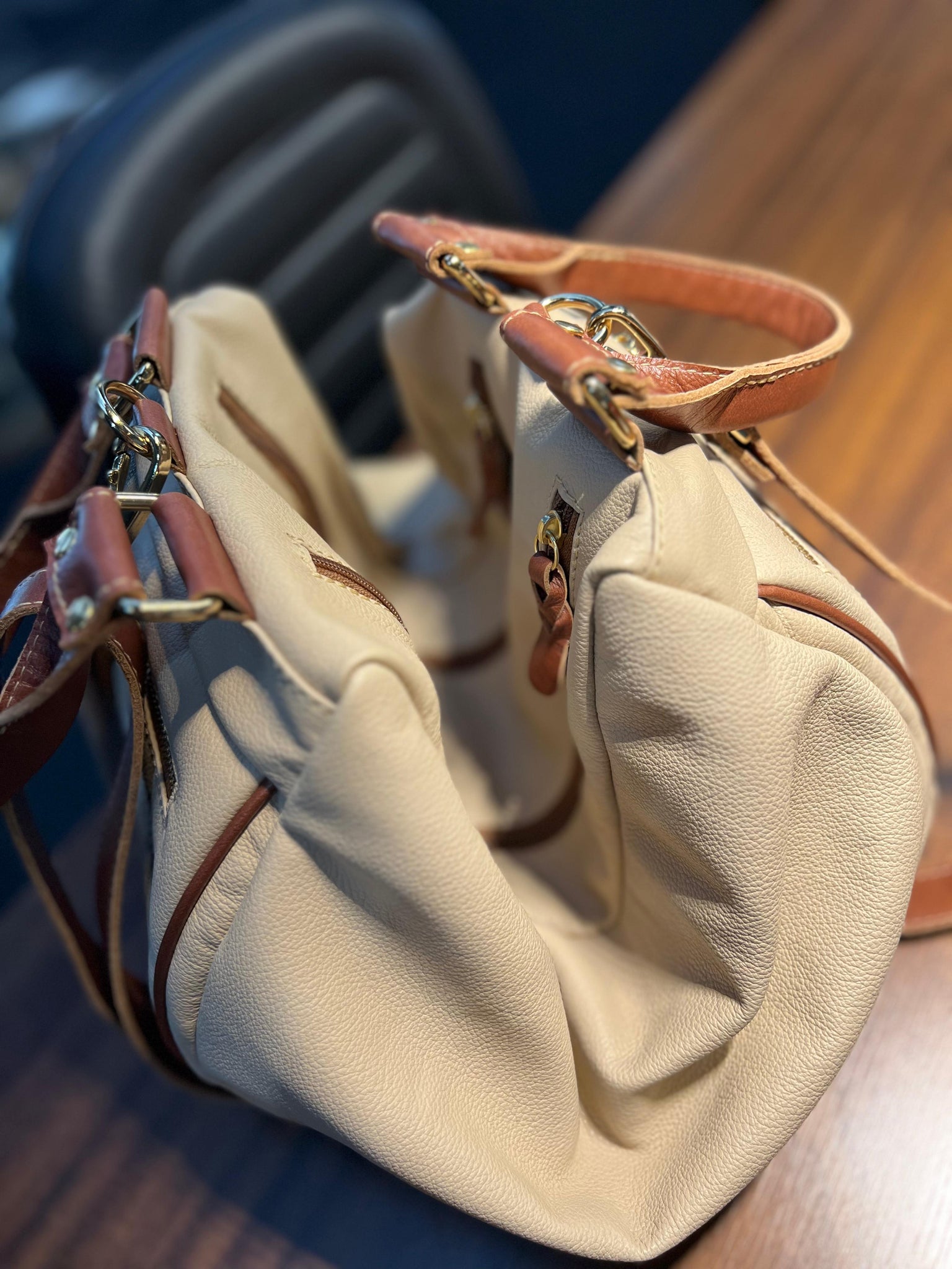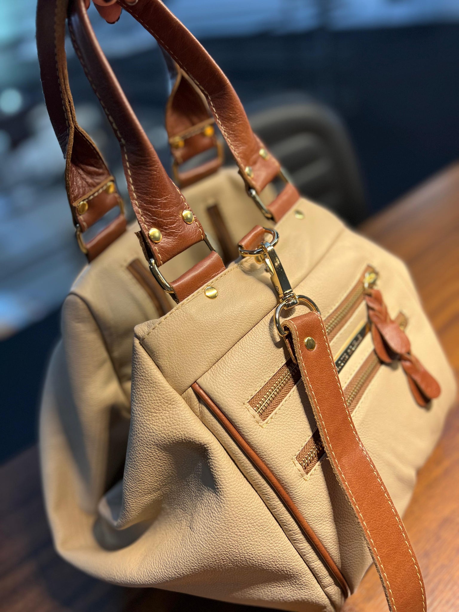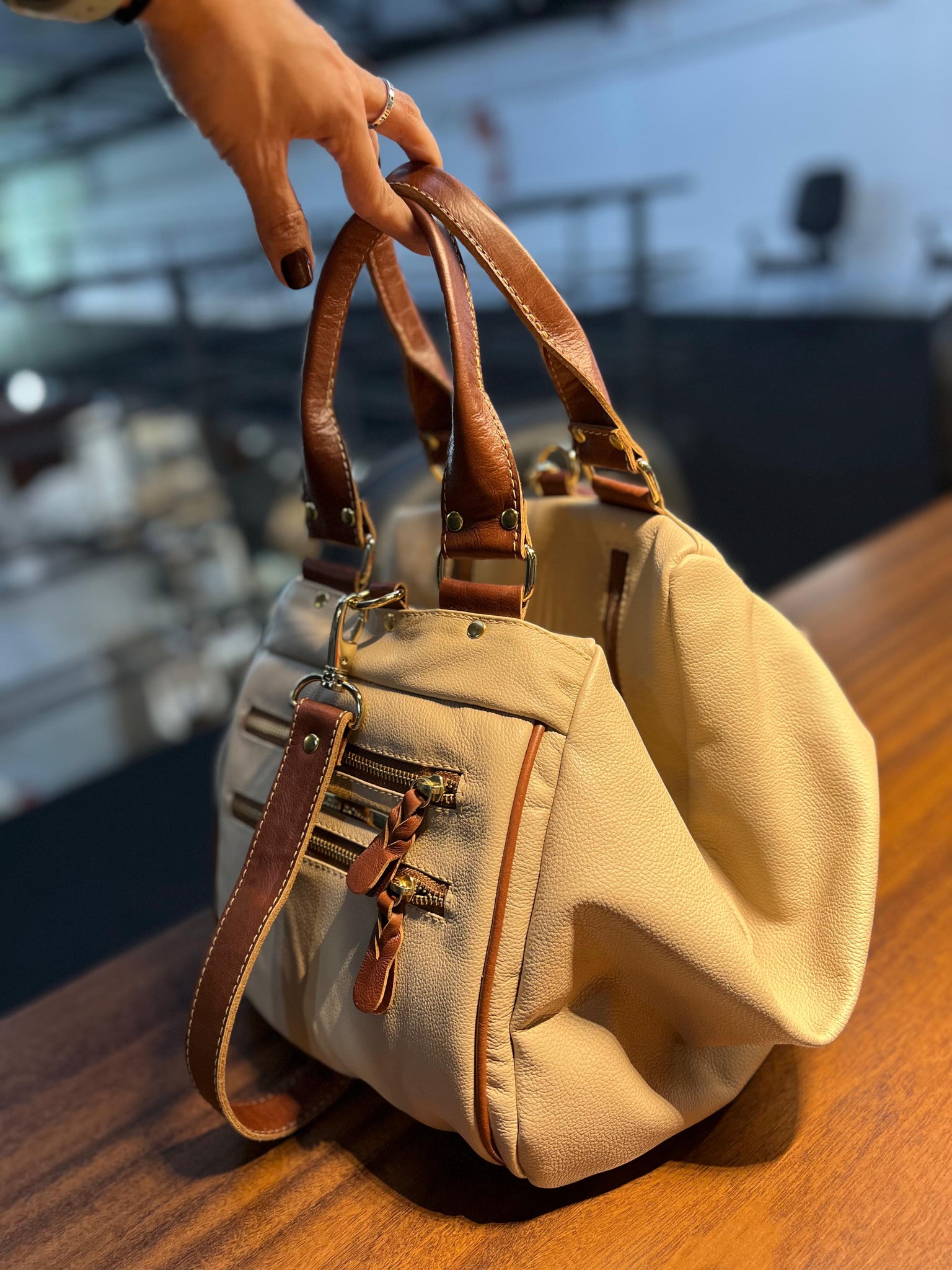 Essa é a bolsa NOVA YORK, feita com 100% couro legítimo e metais de luxo. Ela é grande, cabe tudo, tem 42 cm de largura por 27 cm de altura e 20 cm de profundidade. A bolsa NOVA YORK é única, pois possui um formato sanfonado que esconde seu bolso principal de uma forma charmosa e autêntica.