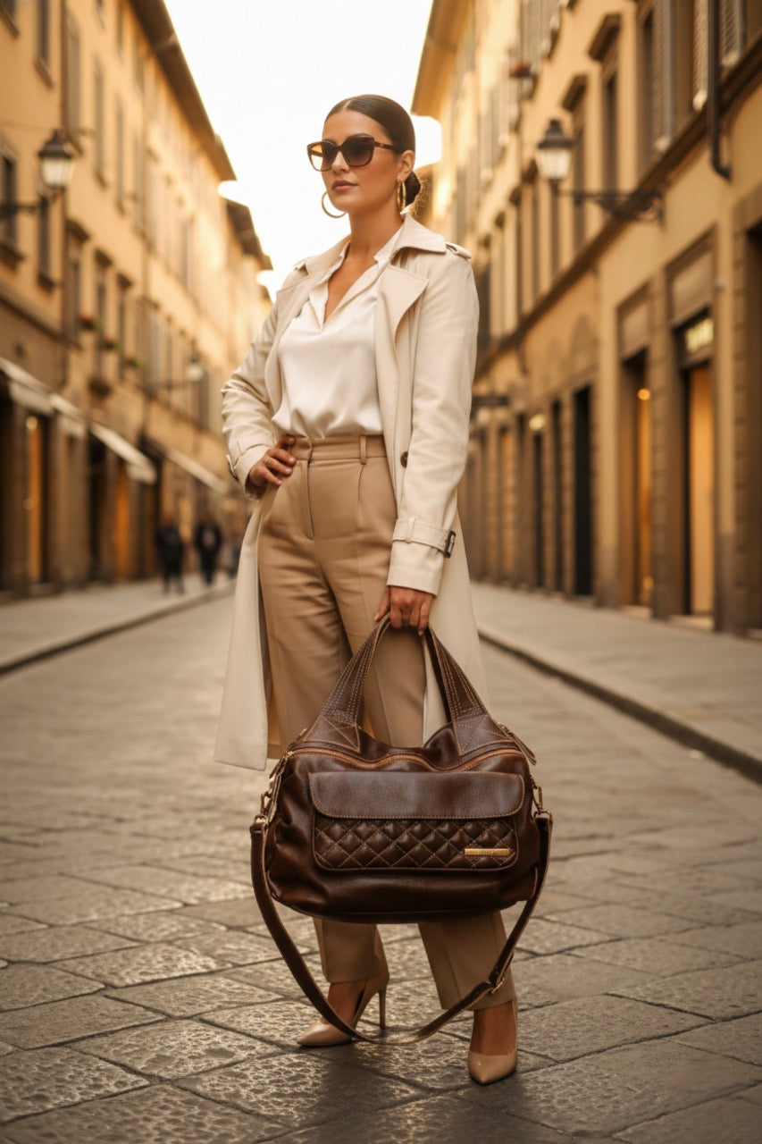 Essa é a bolsa BAHAMAS MATELASSÊ, todinha feita em couro legítimo e metais de luxo. Ela é grande, cabe tudo. Medidas: 27 cm de altura, 41 cm de largura e 16 cm de profundidade.